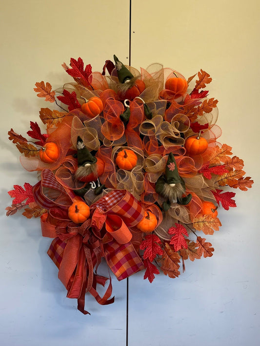 Herfskrans in oranje titen met pompoenen en kabouters