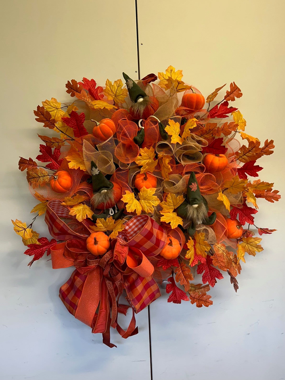 Herfskrans in oranje titen met pompoenen en kabouters